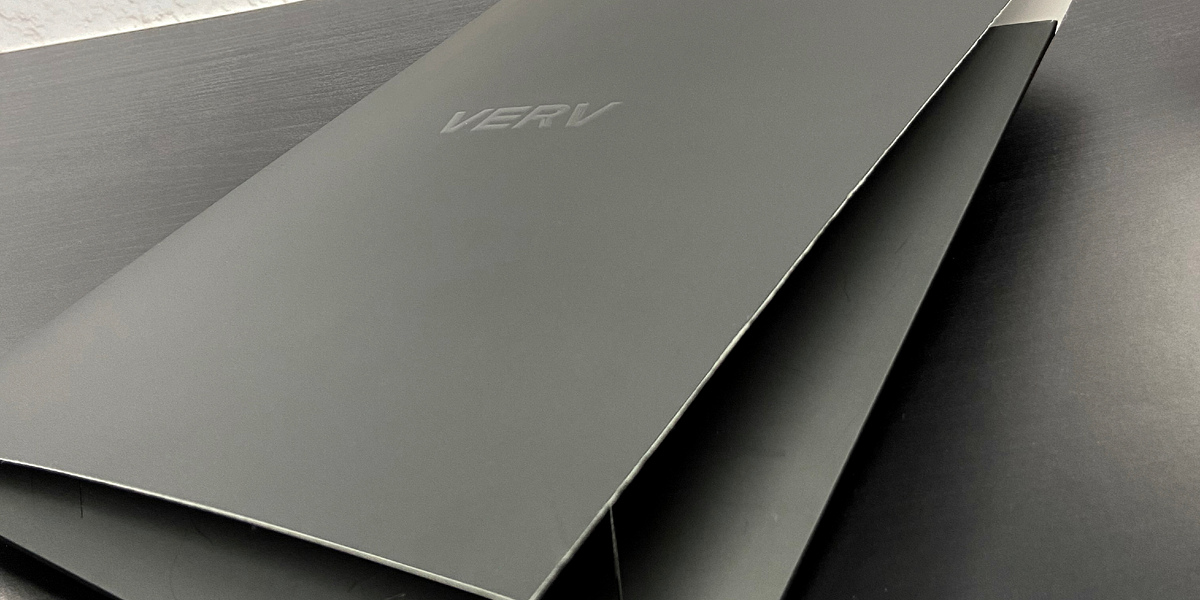 Double sided Matt laminated presentation folders with a specialty blind rasied UV applied at front for logo.